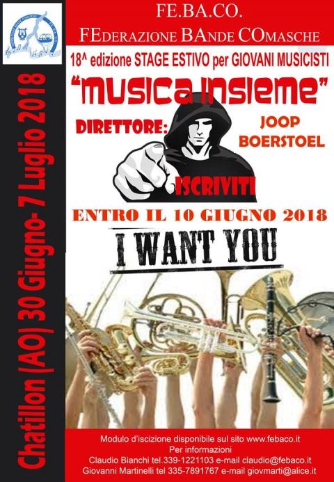 Il Consiglio direttivo FEBACO ha definito la 18a edizione dello Stage Estivo “Musica Insieme” che si svolgerà a Chatillon (Aosta) dal 30 giugno al 7 luglio 2018.
